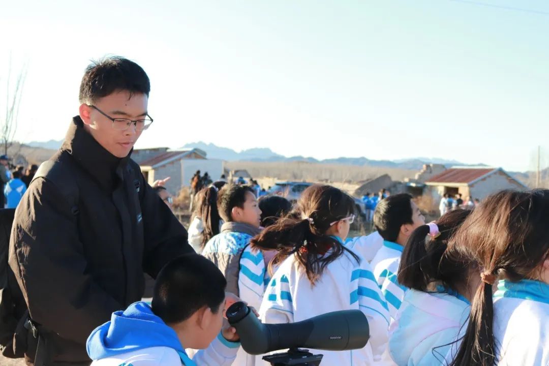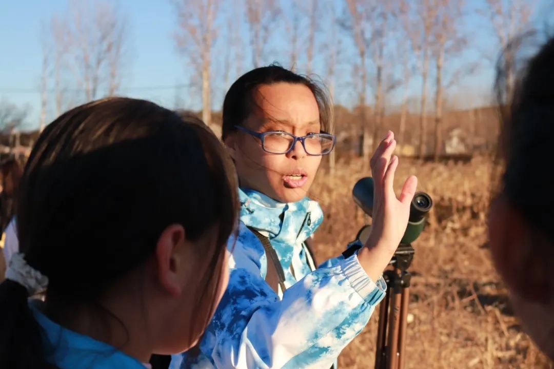 董路老师与宋会强老师不仅引导同学们通过不同类型的望远镜仔细观察鸟类的形态特征,如羽毛颜色、喙的形状、翅膀的长短等,还深入介绍了它们的行为习性、栖息环境以及在生态系统中的重要作用。同学们认真聆听,不时提出问题,现场学习氛围浓厚。