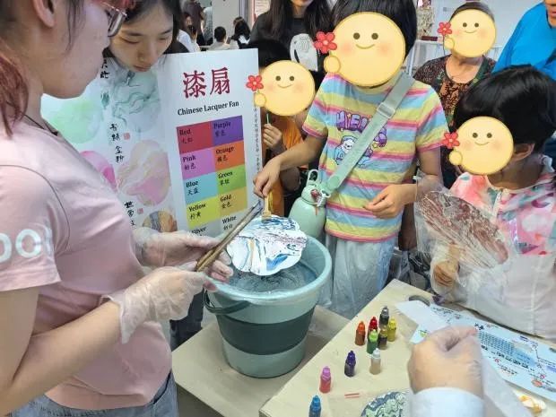 博学党支部通过“多彩中国”系列活动向小朋友们传递中华传统文化之美。共包括京剧脸谱绘制及漆扇制作体验两项活动。脸谱制作活动中辅助小朋友学习京剧脸谱颜色及其代表人物相关知识的同时配合小朋友挑选一个自己喜欢的京剧脸谱人物进行脸谱图案绘制。漆扇制作环节通过中英对照色卡和口语交流等环节引导小朋友挑选喜欢的颜色,在制作漆扇的过程中感受传统文化的魅力。
