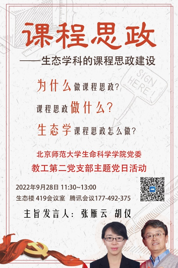 2022年9月28日中午,冰球突破豪华版官方网站教工第二党支部在生态楼419会议室举办了本学期第一次主题党日活动,活动以“生态学科的课程思政”为主题,邀请了支部成员、教务部副教务长兼质量处处长张雁云教授和支部副书记、纪检委员胡仪副教授做主旨发言。支部联系人、学院党委副书记殷实老师参加了会议。