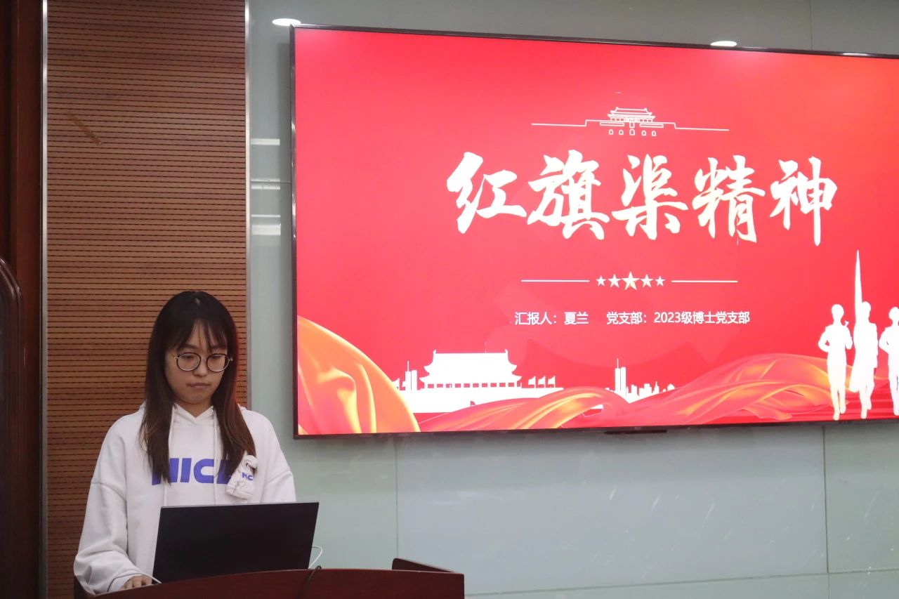 2023级博士党支部夏兰同学以“红旗渠精神”为主题,和以红旗渠的修建过程和红旗渠精神的具体内涵为内容进行讲解。其中,还引入了多位红旗渠的建渠英雄的具体事例来突出红旗渠精神,解析红旗渠精神的内涵。