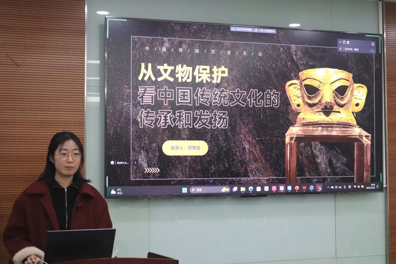 乐育党支部邓荣钰同学从文物保护的主题为切入点入手,讲解了中国传统文化的传承和发扬的相关话题。在讲解中,回顾了文物流失的历史,着眼于构建在“保护中发展、在发展中保护”的文物保护体系同时也提到了当今文物保护的多元的开展方式,最后强调了文物的宝贵价值和文物保护工作的重要意义。