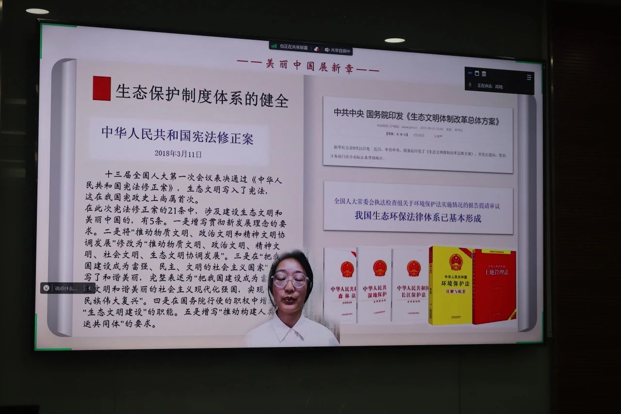 崇德党支部黄彧同学以“坚持绿色发展,建设美丽中国——提升生态系统多样性、稳定性、持续性“为主题,从美丽中国新篇章、生态文明正思想、生态保护明方面三个角度入手展开讲解。