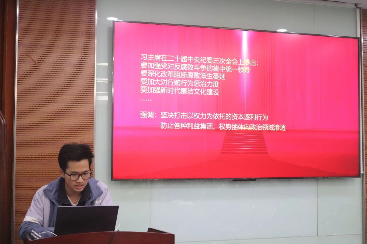 乐育党支部黄文深同学以“热点事件看反腐,热搜排名看‘热搜’”为主题,结合了习近平总书记在二十届中央纪委三次全会上关于反腐败问题的指导,分析近日的社会热点问题。呼吁各位党员一要保持党员先进性,维持现实思考,二要勇于发声,起党员带头作用。