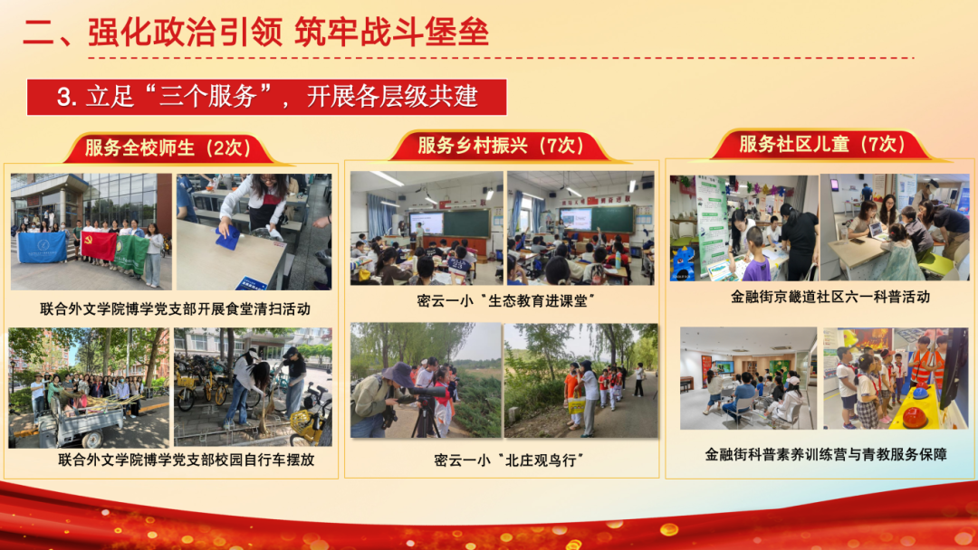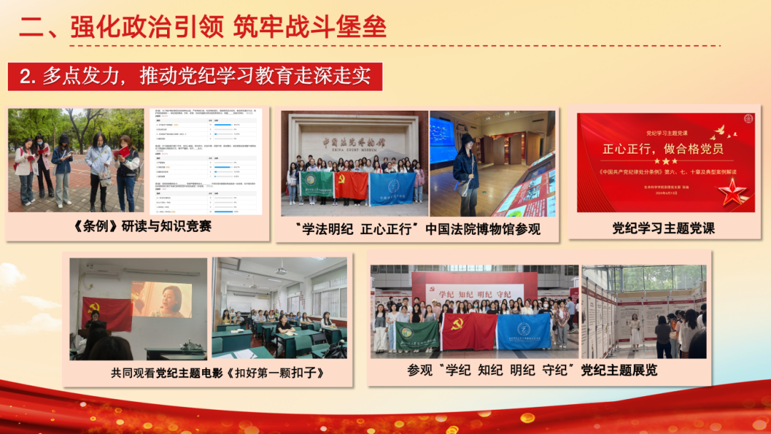 支部持续健全组织建设,2023年9月至今,发展党员4名,按期转正党员1名,吸纳9名新积极分子,出台《请假与考勤制度》、《发展对象选拔标准》等。落实三会一课,召开5次党员大会、8次支委会、15次党小组会及主题党课,赋能党员教育提质增效。同时强化政治引领。一是做好“五个学”,通过学理论、学榜样、研讨学、参观学、实践学,实现教育“走新”更“入心”。二是围绕党纪学习,成员研读《条例》、参观法院博物馆、聆听党纪主题党课、观看党纪电影,使得主题教育更系统、更有实效。三是依托标杆院系示范引领作用,立足“三个服务”,开展各层级共建。服务全校师生,联合外文博学党支部开展“我为师生办实事”等“两联两创”活动;服务乡村振兴,联合密云一小将生态教育带入郊区;服务社区儿童,将金融街志愿服务常态化。