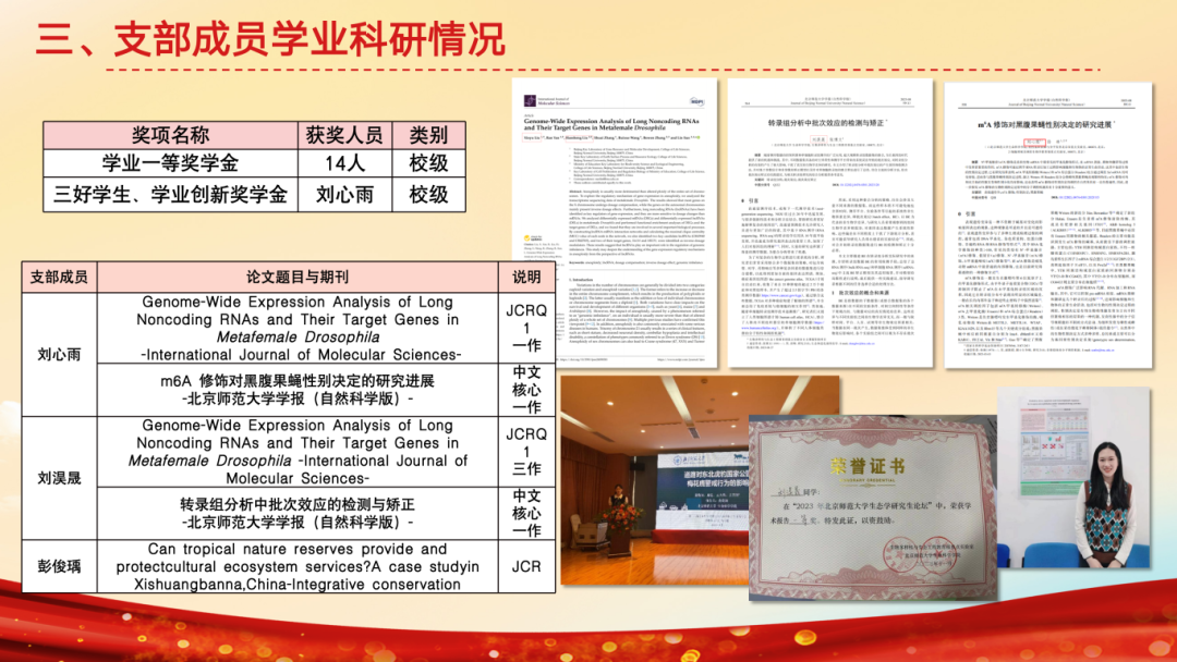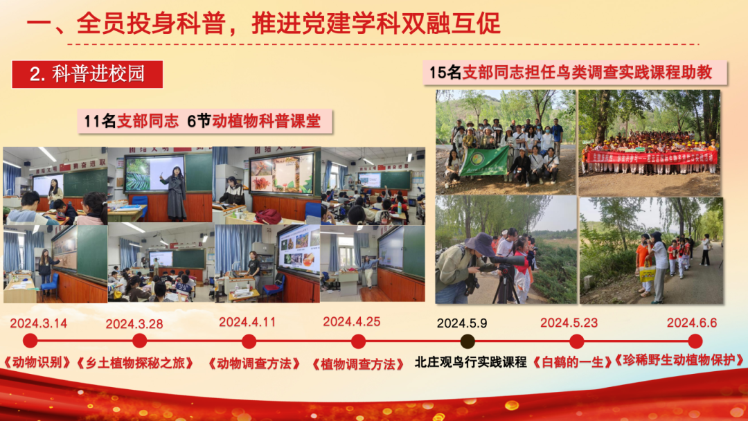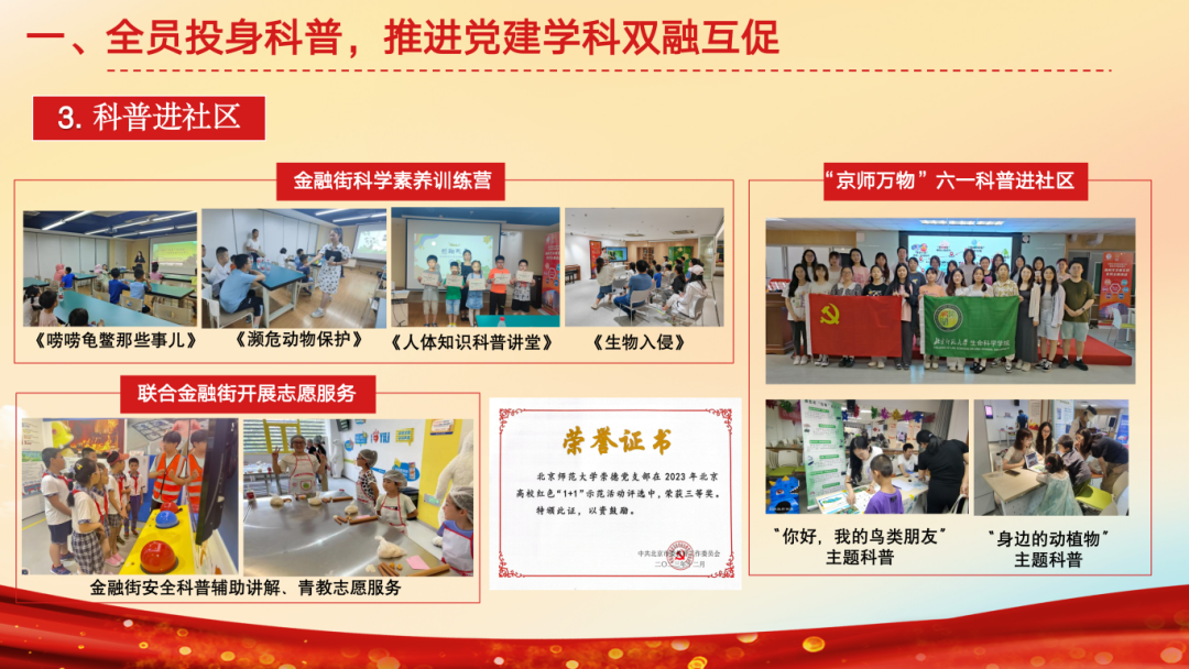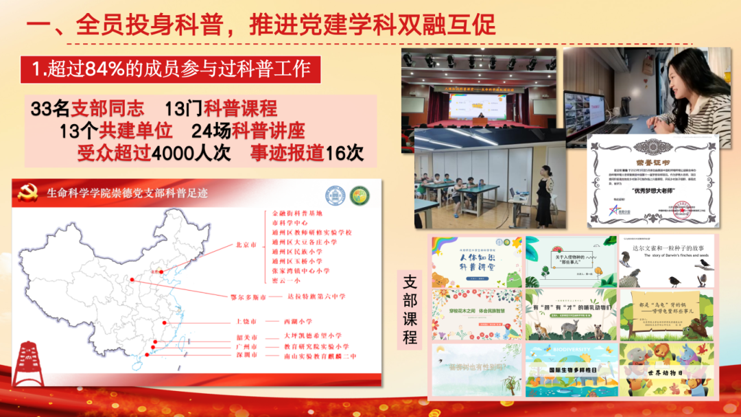 支部依托“崇德向善,以身践行”的核心理念,以青年行动促进全民科学素质提升,重点开展科普工作。支部超过84%的同志参与过科普工作,33名同志设计13门课程,深入市科学中心、通州区各小学,助力首都科普与城市副中心建设;面向广东、江西、内蒙古开设线上课程,成员被美丽中国授予“优秀梦想大老师”荣誉,支部与13个单位开展24场科普讲座,受众超过4000人次。本学期支部11名同志先后赴密云一小主讲6次生态理论课程,帮助学生提升自然观察力;并组织鸟类调查实践教学,15名支部同志担任助教。与金融街深度共建,围绕生态安全、人体健康开展4期科学素养训练营,成员赴安全基地讲解知识,带领小朋友外出参观;今年六一,支部为科普进社区活动设立鸟类及植物科普展区。2023年获北京高校红色1+1示范活动三等奖。同时,推出动植物科普推送,拍摄《珊瑚保护》科普视频,设计《神奇的板蓝根》等3幅海报及《京师万物》等2份科普手册,获校内网络作品创作大赛一等奖、中国生态学会生态科普作品三等奖。此外,聚焦师生关切。着眼研究生课程、实验仪器组织调研,面向支部征集意见,助力学院及支部发展。践行服务宗旨,组织打扫学院大厅、实验室等公共区域,并举办两期生物园种植劳作活动。