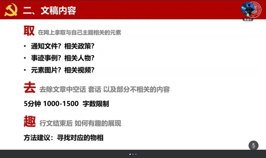 首先,刘梦嘉同学系统梳理了微党课创作要点:微党课需紧扣主题,通过小故事折射大理论,时间控制在5分钟内(讲稿2000字内,PPT约10页),避免内容冗余。选题方面她推荐三类路径:亲身经历、身边故事及党史专题,其中真实经历最具感染力。内容架构需兼顾"叙事"与"明理",既要故事脉络清晰,又要在讲述中自然融入理论升华,避免结尾生硬拔高。她还以自身反腐主题获奖作品为例,示范如何通过排比递进、详实数据增强感染力,建议根据选题风格选择铿锵有力或娓娓道来的表达方式。PPT设计方面,她提醒大家要注重风格统一与配色和谐,善用特殊字体,同时避免大段文字堆砌以保持观众注意力。最后,在现场比赛时,最好脱稿呈现、注意着装得体,可以通过语气变化与肢体语言提升感染力。