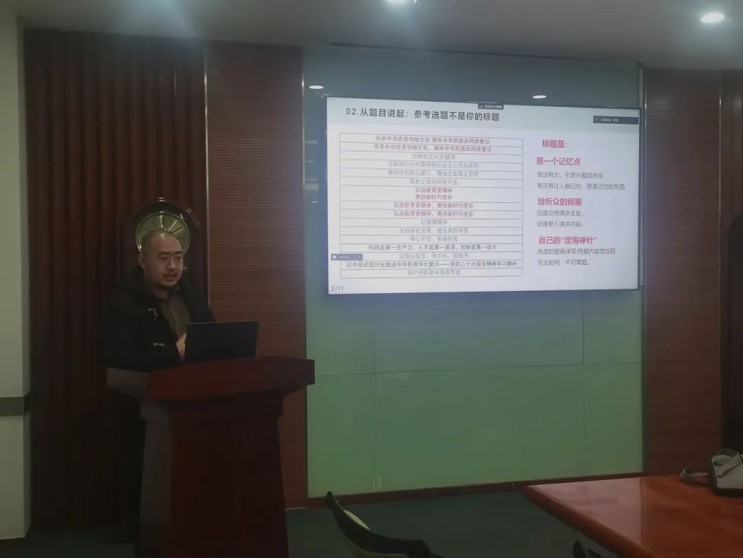宫一男同学以历届微党课大赛的决赛作品作为案例,针对各位同学的标题给出指导意见,“主题要聚而精,切入要小而巧,架构要简而清”。在内容展开方面,要找准五个“点”,既要保证逻辑通顺、结构严密,又要在经历、功课、思考上做出自己的独到之处,观点收束联系现实指导意义;具体表现形式上同样需要找准三个“点”,掌握技巧提高作品的表现力。从题目的选取和找准内容的“五点”等方面谈起,不仅能帮助各位同学走出一些误区,还提供了宝贵的经验借鉴。