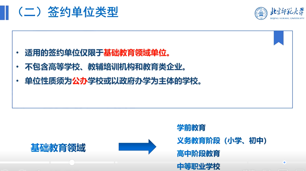 对于签约单位的要求为:①仅限基础教育领域单位(如幼儿园、小学、初中、高中、中等职业学校);②不包含高等学校、教辅培训机构和教育类企业;③并且单位性质须为公办学校或以政府办学为主体的学校。