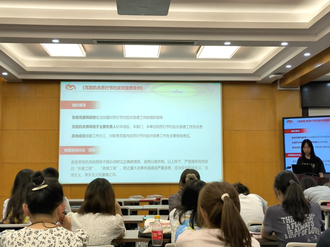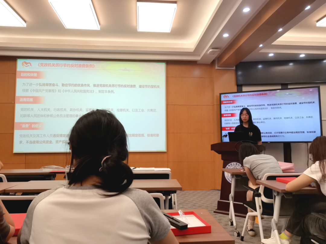 首先,陈昱臻同志从《党政机关厉行节约反对浪费条例》切入,介绍中央八项规定精神。就条例中关于差旅、因公出国、公务接待、会议活动、办公用房、资源节约、监督追责的多方面管理规定进行了讲解,深入介绍了中央八项规定精神中部分内容。同志们共同认真学习条例内容。