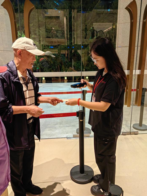 其余志愿者则分别承担检票与引导职责:检票岗位的志愿者仔细核对观众票务信息,确保入场秩序;引导岗位的志愿者在剧场入口至座位区之间往返,为迷路观众指引方向,同时主动帮扶行动不便的老年观众,协助其顺利就座。各岗位志愿者虽职责不同,但均以“为观众服务”为核心,在各自岗位上认真履职,且在需要时相互补位,形成高效协作的服务氛围。