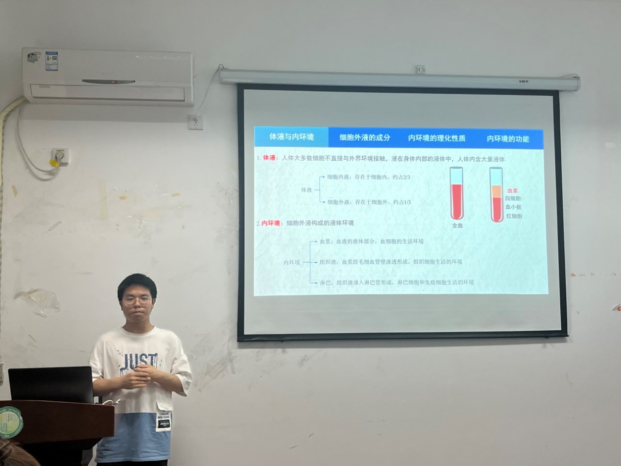 黄鸣政同志试讲的主题是《细胞生活的环境》。课程从体液和内环境、细胞外液的成分、内环境的理化性质、内环境的功能四个环节展开,课程内容科学严谨,每个环节均设置了快问快答,以便及时检测和巩固。