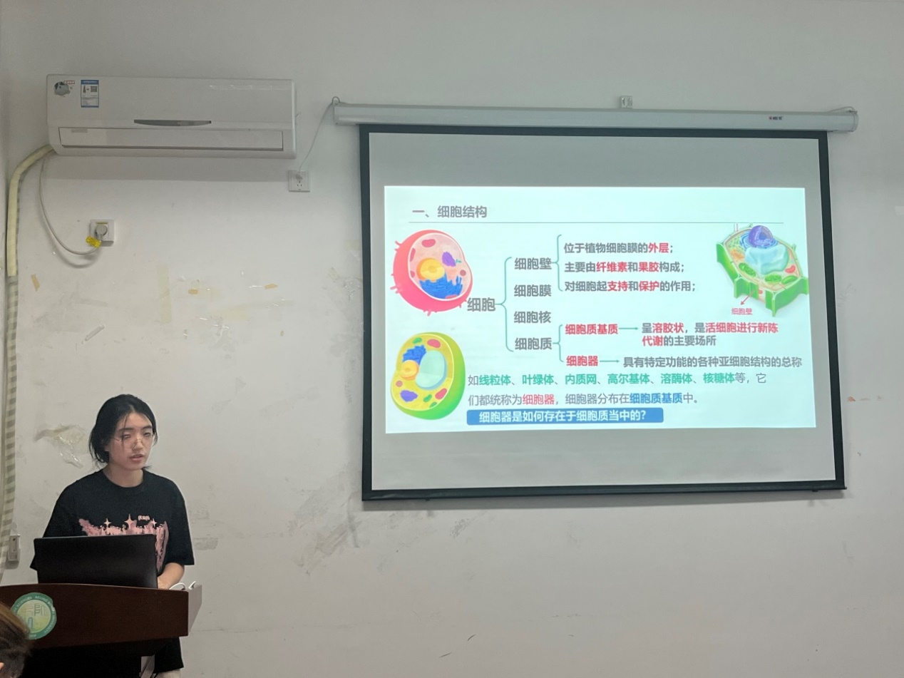 陈思涵同志试讲的题目是《细胞器的结构和功能》。她通过精美细致的图片为学生们展现了细胞的基本结构,随后讲解了不同细胞器的结构和功能,并通过对比引发学生思考,最后还设计了习题检验学习效果。