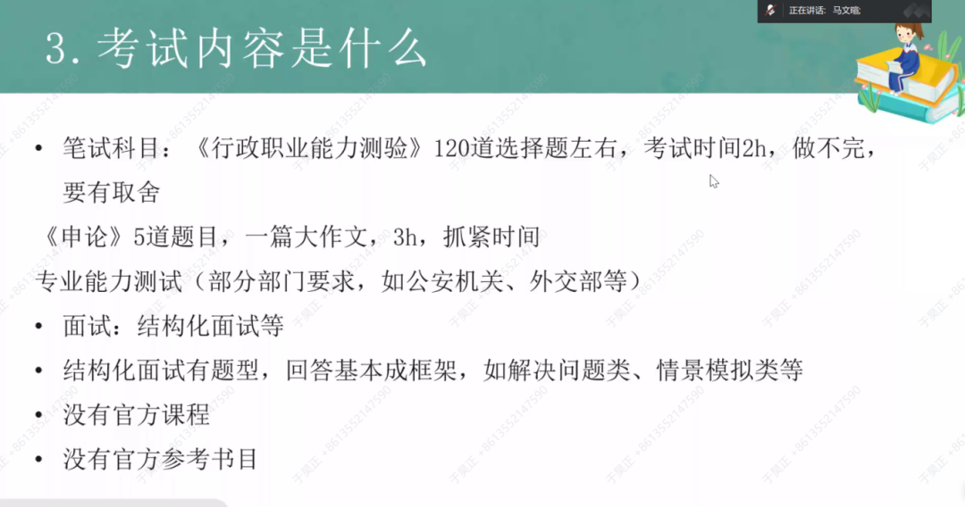马文暄师姐首先介绍了选调生以及公务员备考的几个重要环节,包括获取考试信息,明悉报名要求,了解考试内容,分享备考方法等。