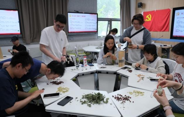 最后环节,北师大的同学们精心准备了香囊制作材料。制作过程中,大家一边制作香囊,一边在卡片上书写“清正”“奉献”等廉洁关键词,随后将满载寓意的寄语卡片放入香囊。这些香囊以青白二色棉麻布为材,填充艾草、薄荷等香料,取“清清白白”“祛除杂念”之意;红色细绳缠绕其间,暗喻“坚守纪律红线”。