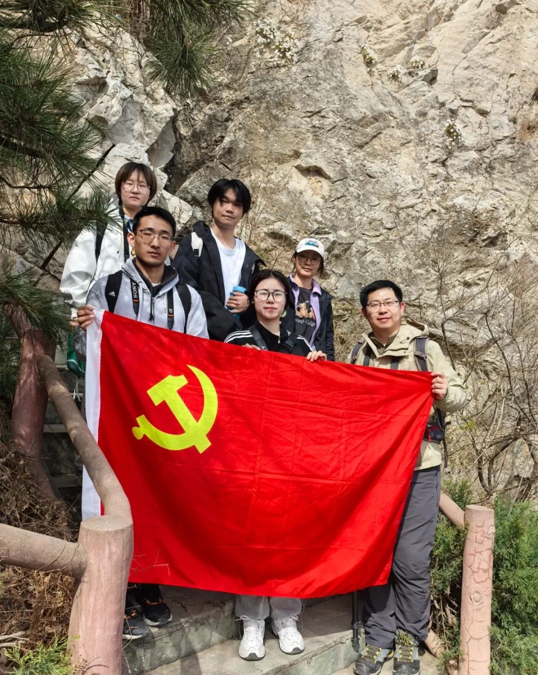 清晨的千灵山北门,薄雾中党旗格外鲜红。在“双带头人”何毅老师带领下,师生党员以“发现一个物种、解析一个基因、感悟一种精神”为指引,正式开启生态征程。