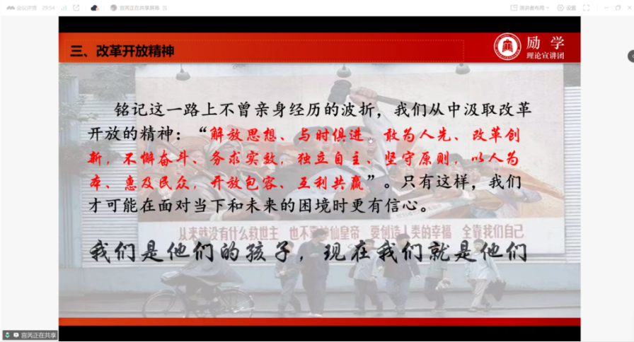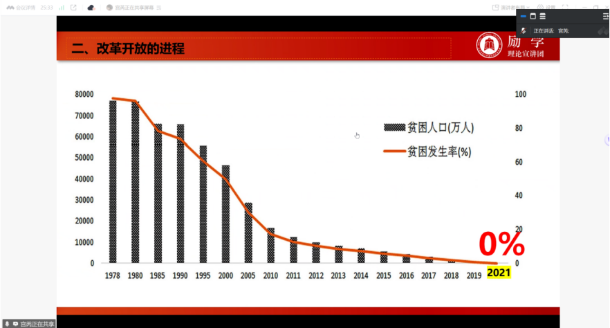 宫芮详细介绍了改革开放的时代背景、发展历程及其精神内涵。她从“全面的群体性贫困”这一严峻现实出发,生动描绘了当时中国面临的复杂国情,包括复杂的地形、多样的气候以及资源分布不均等问题,这些因素交织在一起,使得贫困问题显得尤为棘手。然而,正是在这样的艰难开局下,国家提出了“让一部分人先富起来,先富带动后富,最终实现共同富裕”的战略,成功点燃了农村改革的星火,小岗村“包产到户”的实践成为改革的标志性起点。此后,脱贫攻坚战稳步推进,贫困率从90年代初的约70%降至2021年的0%,全面建成小康社会,实现了从群体性贫困到区域性贫困再到全面脱贫的历史性跨越。