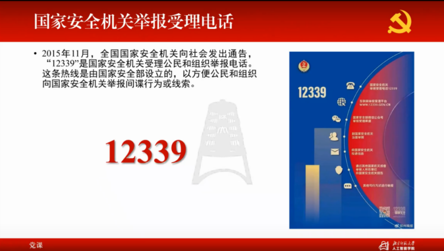 随后,张恒轩还介绍了《中华人民共和国国家安全法》第七十七条中关于公民和组织应当履行的国家安全义务,包括及时报告危害国家安全活动的线索等,并明确了国家安全机关举报电话“12339”及其他举报渠道。随后,与会同志一同观看了《创新引领,国安砺剑》专题片。专题片总结回顾了总体国家安全观提出十年来国家安全机关破获的十个重大间谍案件,揭示了境外间谍情报机关渗透、窃密、策反的卑劣手法,进一步强化了党员的反间防谍意识,让间谍“无处遁形”。