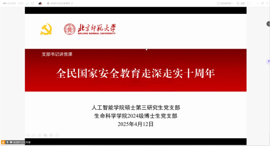 2025年4月15日晚19时,2024级博士党支部联合人工智能学院硕士第三研究生党支部、硕士第四研究生党支部、博士第一研究生党支部共同开展理论联学活动。本次会议邀请党委学生工作部励学理论宣讲团宣讲员宫芮做宣讲,主题为“改革开放:我们一直在路上”。随后,由人工智能学院硕士第三研究生党支部书记张恒轩围绕全民国家安全教育主题展开党课学习。本次会议由张恒轩同志主持,共40余名党员和部分入党积极分子参与。