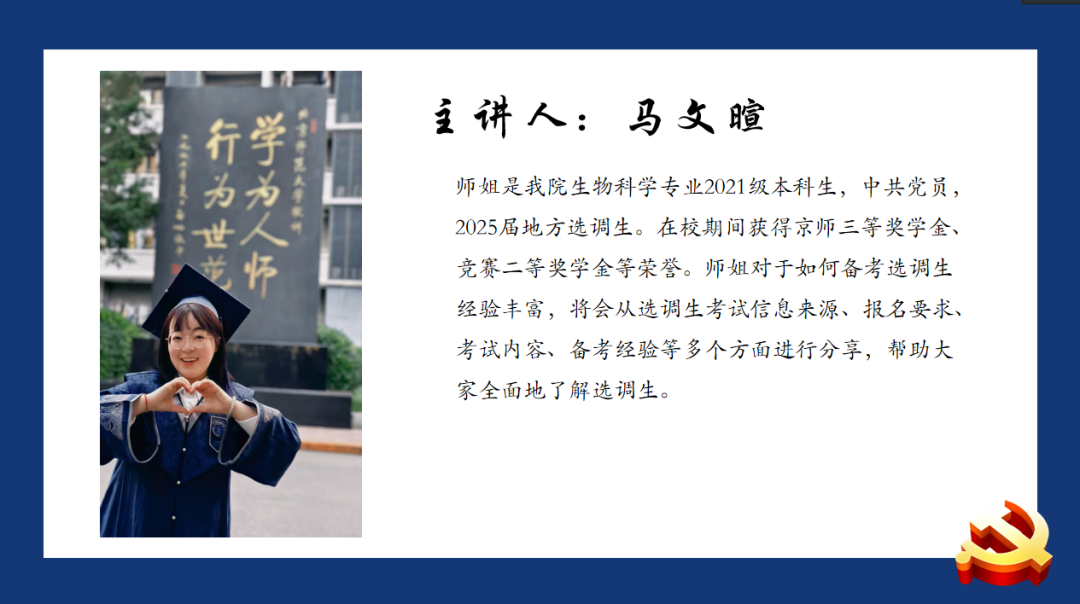 马文暄师姐首先介绍了选调生以及公务员备考的几个重要环节,包括获取考试信息,明悉报名要求,了解考试内容,分享备考方法等。