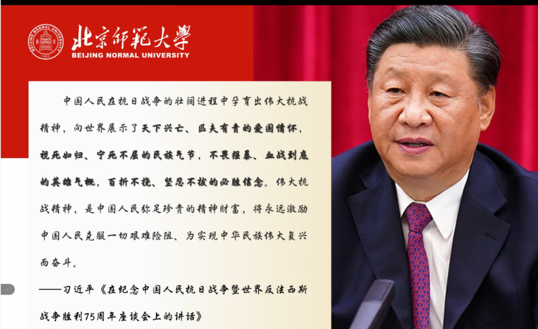 最后是新中国的诞生以及党的领导下新中国的建设。吴梓煜同志为大家讲解了中国式现代化的进程,以及为实现中华民族伟大复兴和实现中国式现代化建设所需要的坚持。习主席的讲话中也提到了“中国人民在抗日战争的壮阔进程中孕育出了伟大抗战精神”。同学们也从抗战精神中汲取力量,并运用到今后的学习生活中去,接过时代的接力棒,百折不挠,坚韧不拔,为实现中华民族伟大复兴而奋斗。