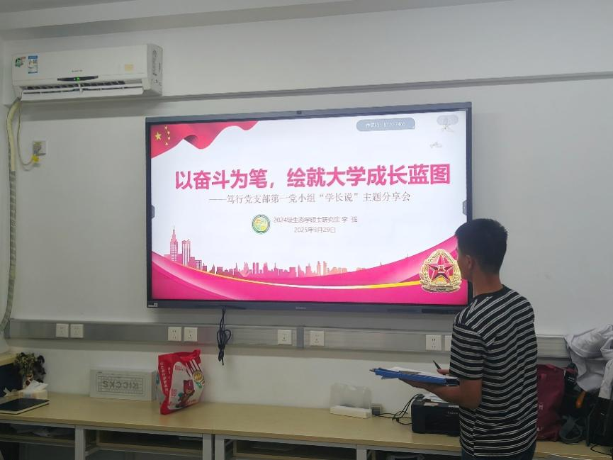 2025年9月29日,笃行党支部书记、2024级生态学硕士研究生李强同志以“以奋斗为笔,绘就大学成长蓝图”为主题,拉开系列活动序幕。