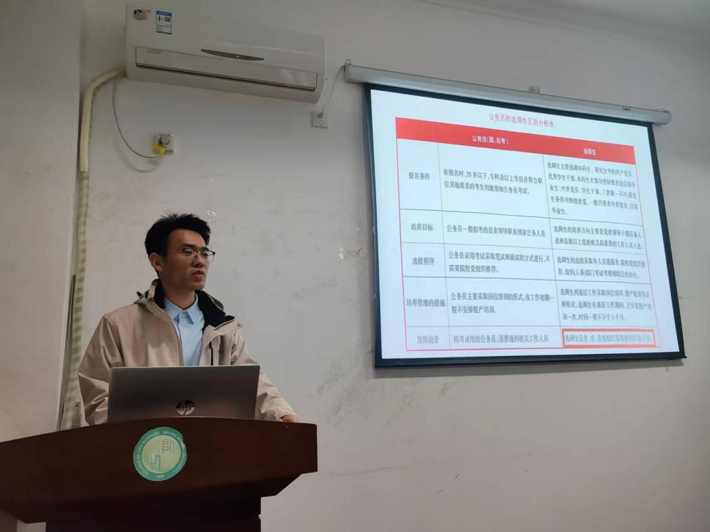 会上,贾康宁同志系统梳理了各类公务员招录渠道,包括国考、选调、中央选调、北京选调、其他各省选调、省考、国安、京考,以及今年的新政策“选培”计划等。他不仅详细解读了各类考试的报考流程与关键节点,还结合自身了解,生动描绘了不同岗位的工作内容与发展路径,为同学们打开了通往公共服务事业的一扇窗。互动环节中,同学们踊跃提问,现场气氛热烈。贾康宁同志以其扎实的知识储备和真诚的分享态度,耐心细致地为大家答疑解惑。会后,也得到了大家积极的反馈,同学们纷纷表达了由衷的感谢与深刻的触动,表示:这次分享如同一场‘及时雨’,为我们拨开了职业规划的迷雾。不仅清晰地勾勒出生态、生科学子的公职之路,更让我们深刻体会到将专业所学融入国家发展的时代责任。这份来自前辈的指引与组织的关怀,真挚而温暖,极大地坚定了我们服务人民、建设祖国的信念与决心。