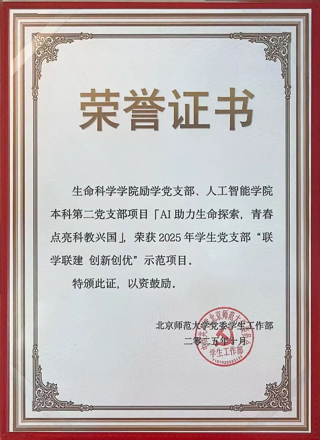 在冰球突破豪华版官方网站2025年党支部“联学联建 创新创优”项目评选中,冰球突破豪华版官方网站励学党支部和人工智能学院本科生第二党支部共建项目“AI 助力生命探索,青春点亮科教兴国”获评示范项目。