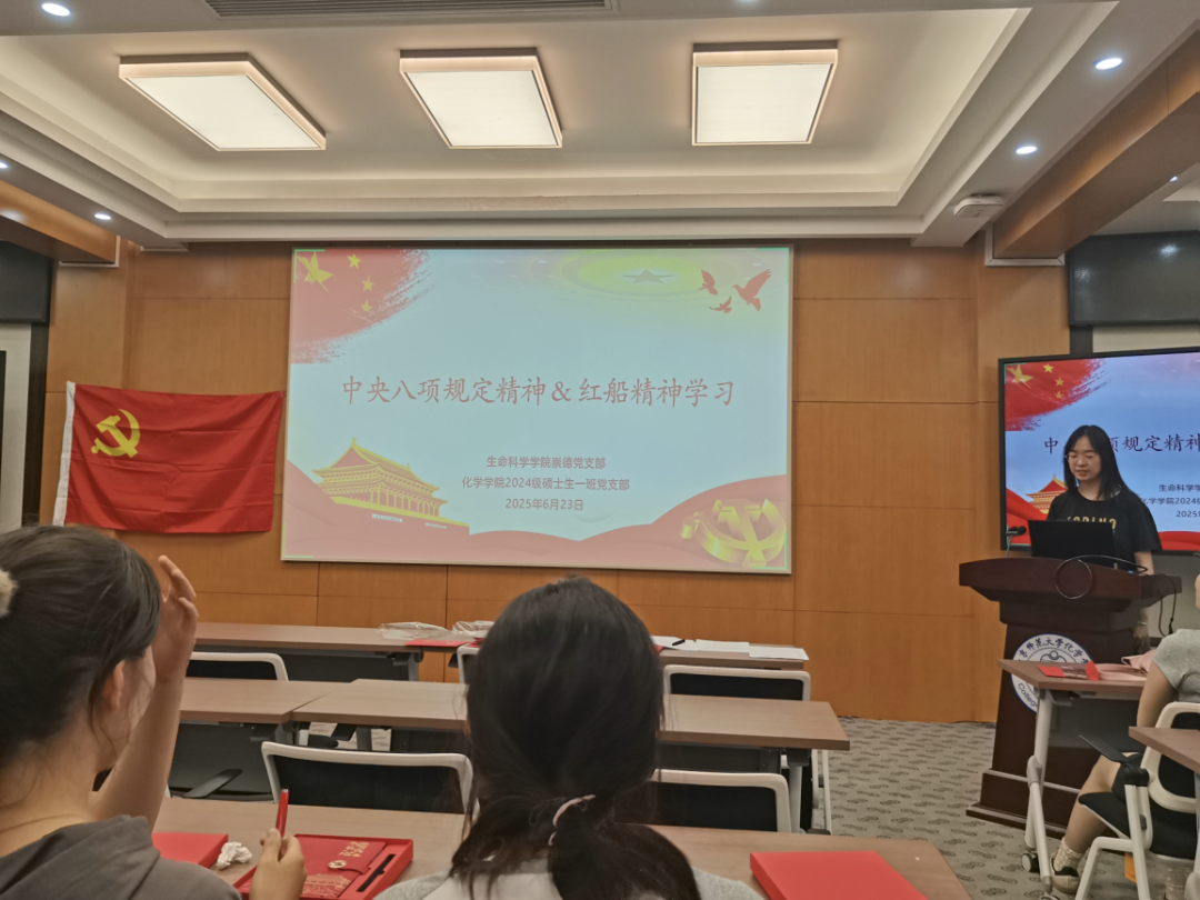 2025年6月23日19:00,冰球突破豪华版官方网站崇德党支部联合化学学院24级硕士生一班党支部在化学楼二楼学术报告厅开展支部书记讲党课活动,会议由崇德党支部书记陈昱臻同志和化学学院24级硕士生一班党支部书记武文琦同志主持。本次党课的主题是:中央八项规定精神和红船精神。
