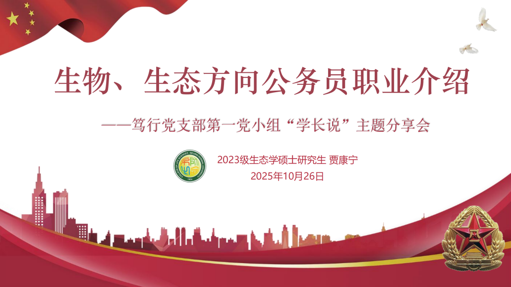 2025年10月党小组会中,邀请笃行党支部党员、2023级生态学硕士研究生贾康宁同志为支部同学介绍生物、生态方向公务员职业,为同学们未来的职业规划点亮了一盏引路明灯。