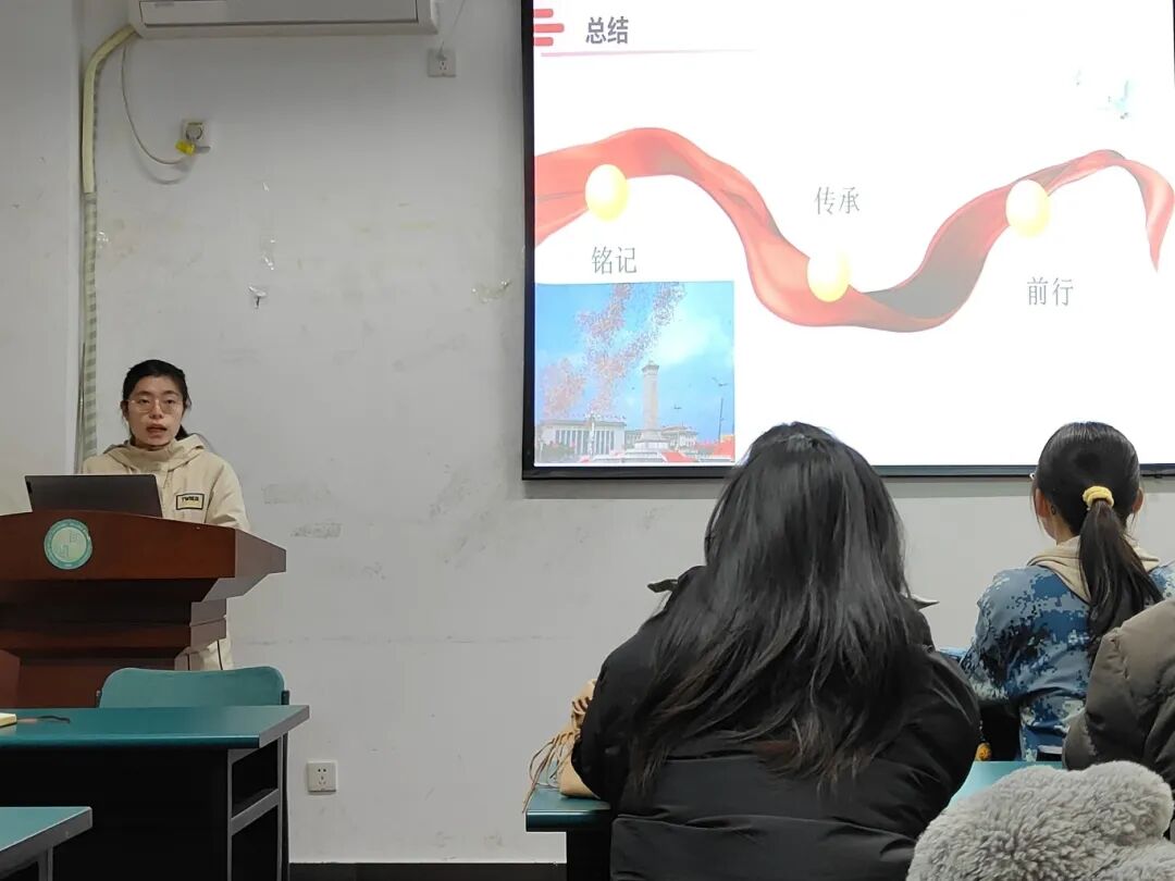 李嘉怡同志以《铭记杨靖宇事迹,传承抗战精神》为题,分享了抗日民族英雄杨靖宇同志的光辉事迹。从青年投身革命、领导东北抗联,到弹尽粮绝壮烈牺牲,杨靖宇以“腹中唯有草根、树皮”深刻诠释了信仰的力量。随后,李嘉怡同志结合思想、学业与工作,探讨了抗战精神带来的深刻启示:要始终坚定理想信念,厚植家国情怀,并在实践中锤炼坚韧品格。历史川流不息,精神代代相传,激励新时代青年要从这段烽火岁月中汲取前行力量,勇担使命,接续奋斗。