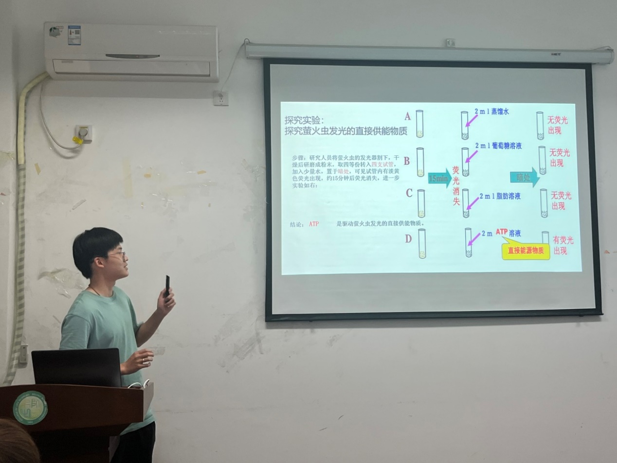张灏焱同志试讲的主题《细胞的能量“货币”——ATP》。课程以萤火虫发光作为导入,在课堂中扩展了丰富的内容,如“探究萤火虫发光的直接供能物质”探究实验、各种拓展资料等,以促进学生对ATP概念的建构。