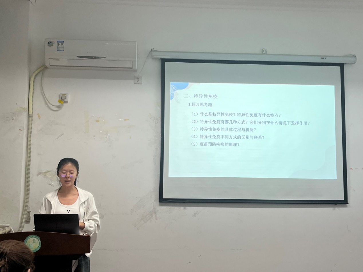 杨子怡同志试讲的主题是《特异性免疫》。课程详解介绍了体液免疫和细胞免疫的过程,其中设置了课前预习题、课后小结,以及角色扮演活动,课程内容详实、完整。