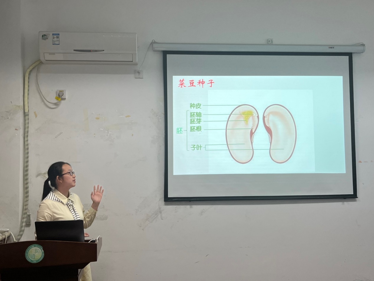 倪沅蕙同志试讲的主题是《种子的结构》,在课程中设计了观察与解剖种子的探究环节,详细介绍了菜豆种子和玉米种子的结构,还通过视频直观展现了种子萌发的过程,串联了前面的知识,并以思考题的形式引出了下节课程的内容,整体逻辑连贯、设计巧妙。
