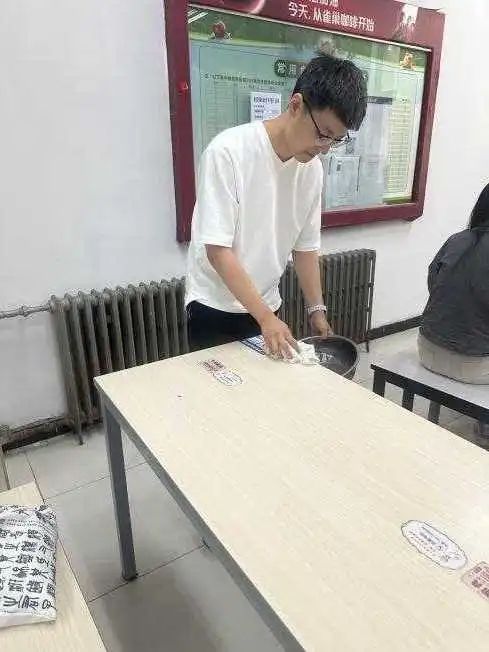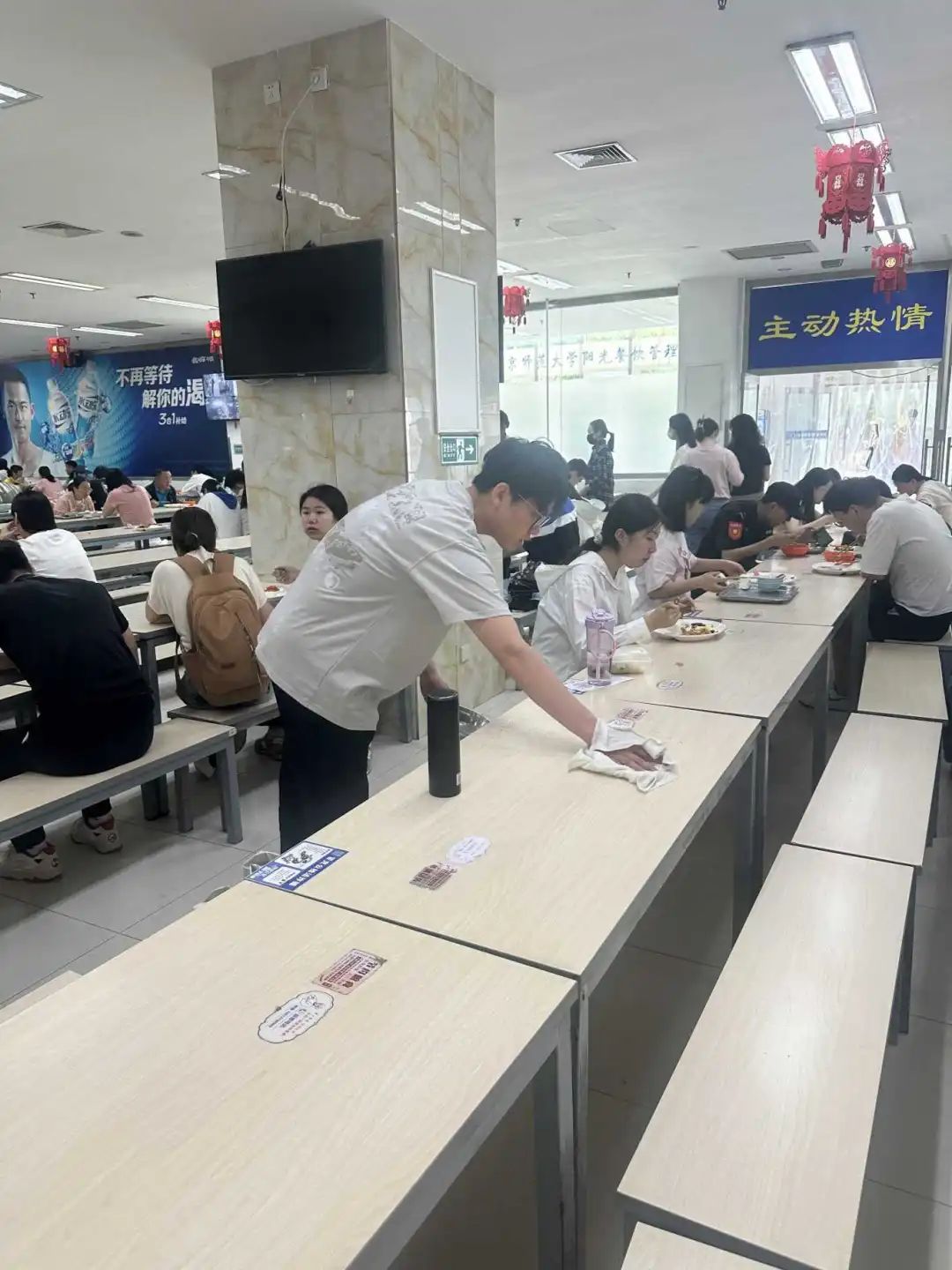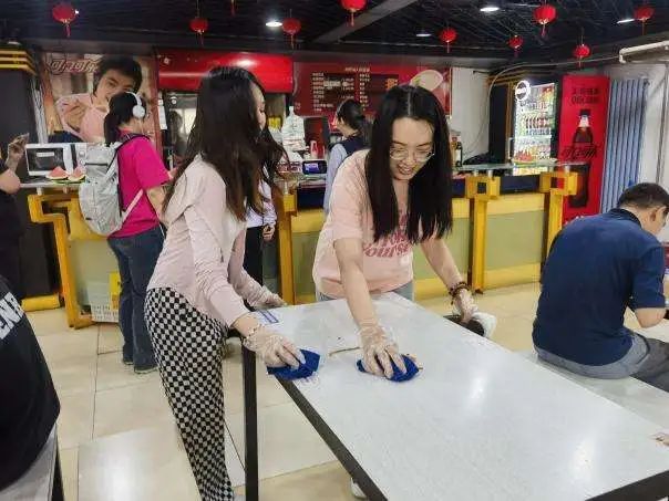 本次活动我主要参与了学五食堂二楼的桌面清洁工作。食堂阿姨告诉我们,毛巾分为两块,一块用洗涤剂浸湿,用于擦拭桌面上的油污,另一块为干毛巾,用于将湿毛巾擦拭过的桌子上残留的水渍和洗涤剂擦走。端着铁盆在食堂中巡回打扫的时候,我感受到了这一岗位的重要性,由于午间就餐人流量大,如果不及时清洁脏污的桌面,会导致可用的座位变少,不便于师生就餐。虽然只是短短的一个小时志愿,却也算是“为师生办实事”,也让我体会到了食堂阿姨工作的不容易,感谢她们!