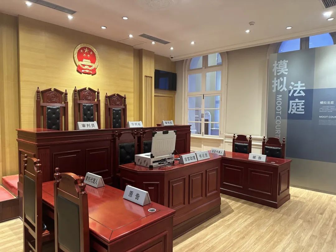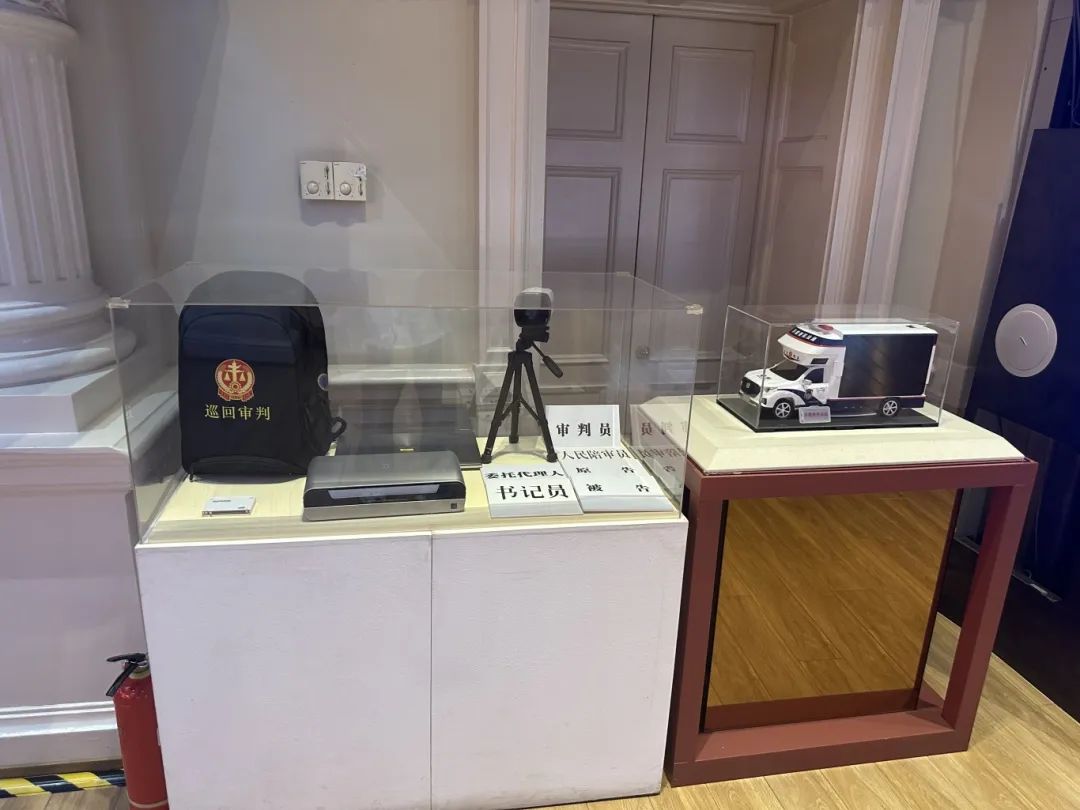 照片中是中国法院博物馆的模拟法庭区域。法庭的布局严谨而规整,审判席、原告席、被告席等一应俱全,仿佛在静静地诉说着法律的庄重与威严。 法庭是司法审判的基本场所,其组成和发展经历了长期的演变和完善。