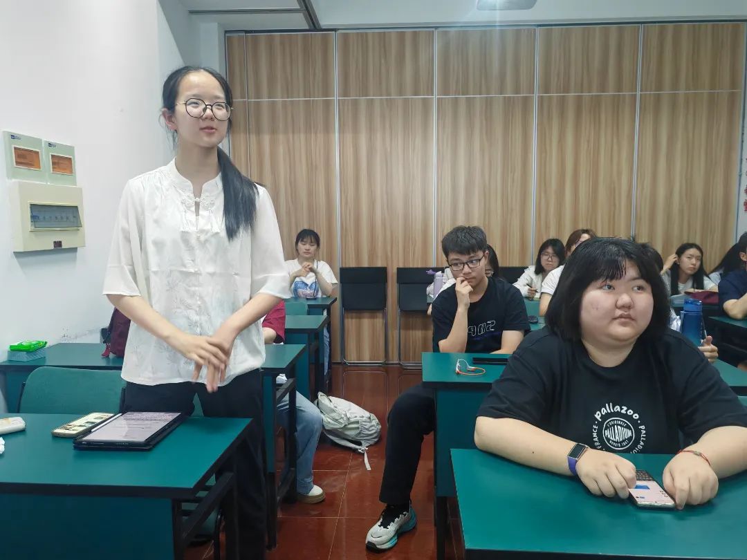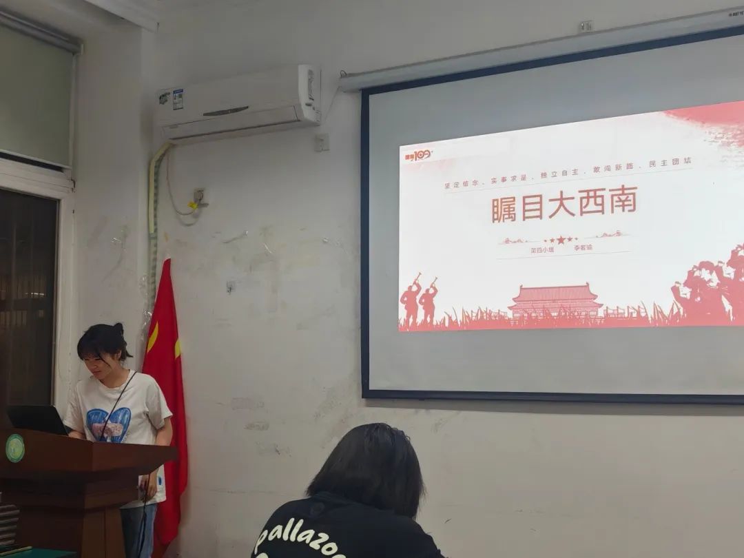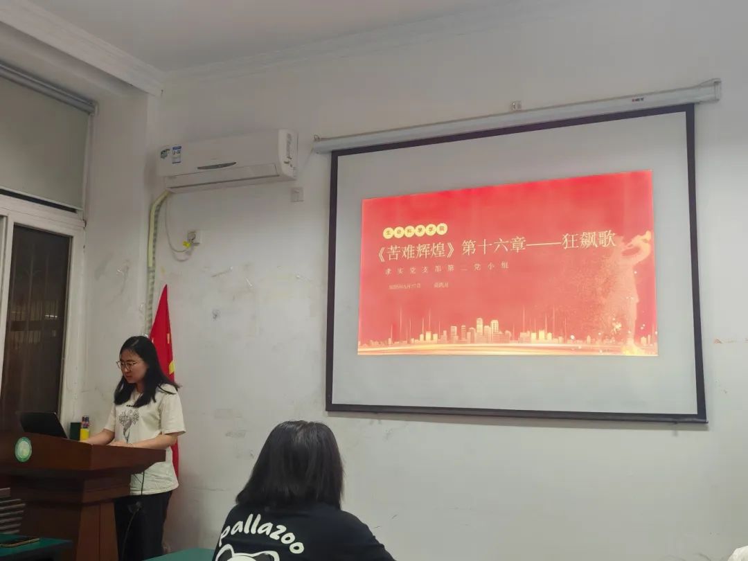 第一党小组的杜钿分享了《苦难辉煌》第五章《崛起》,介绍了日本军国主义崛起的背景以及中国共产党在困境中的发展壮大历程,通过分享电影片段和相关历史故事,推荐有关纪录片,全面生动地展现了这一特定时期的历史背景与重要历史事件。