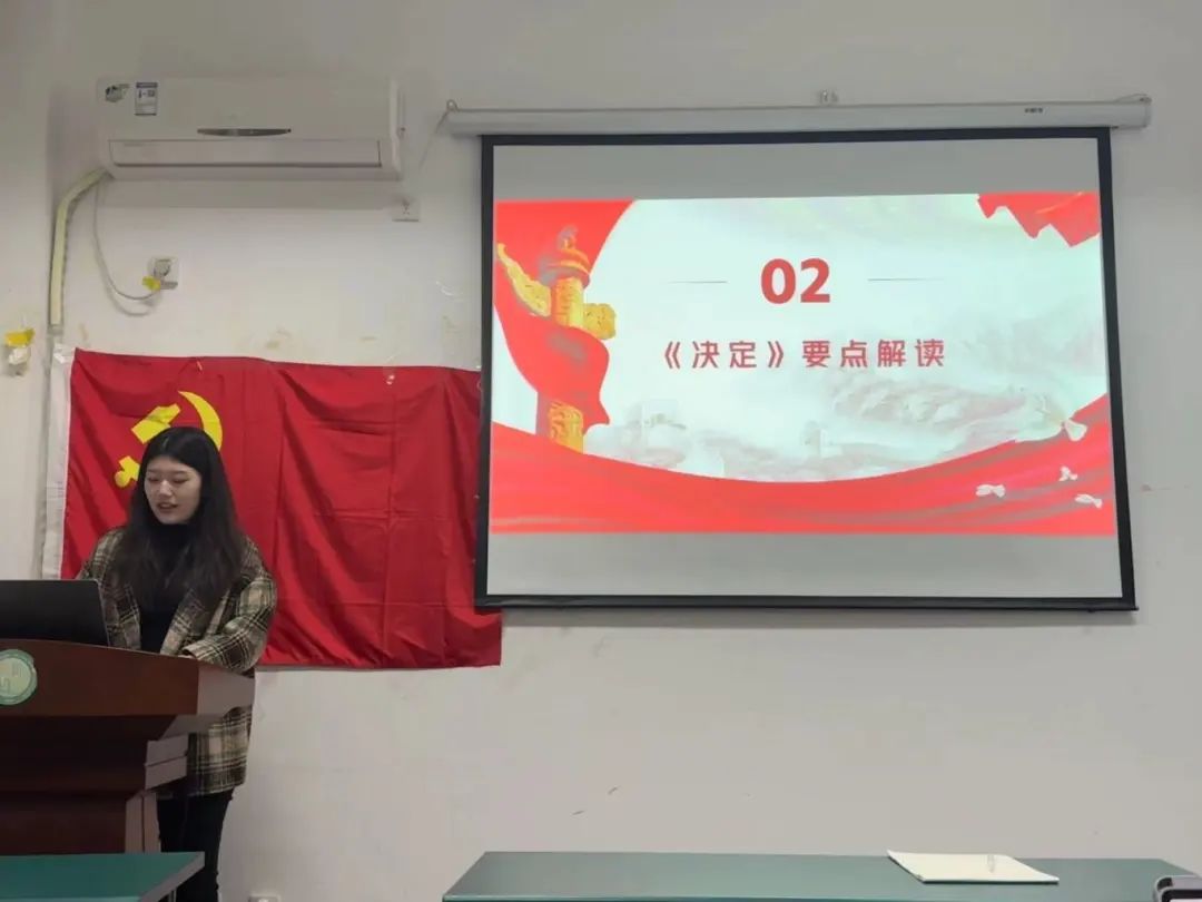 会议第一项,求索宣讲团樊亦聪同学进行《“数”读党的二十届三中全会精神》主题宣讲,为支部成员详细讲解党的二十届三中全会的精神实质和深远影响。