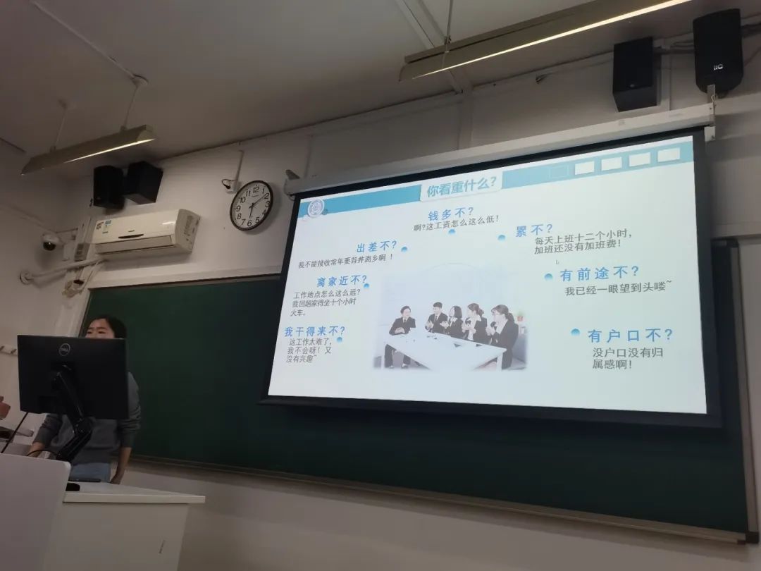 接着王倩倩师姐分享了一些对找工作的见闻和感想。师姐对就业情况抱有积极态度,并且在工作的选择上提出可以参考的几个标准,比如薪资情况、出差情况、劳累情况、发展前途、户口情况、通勤情况、工作难度、意向城市等多个维度。并指出如果一项工作可以符合自己看重的2-3个标准,即可列入重点考虑。其次,师姐鼓励同学们多投简历,“广撒网”也可以帮助提高自己的面试经验。