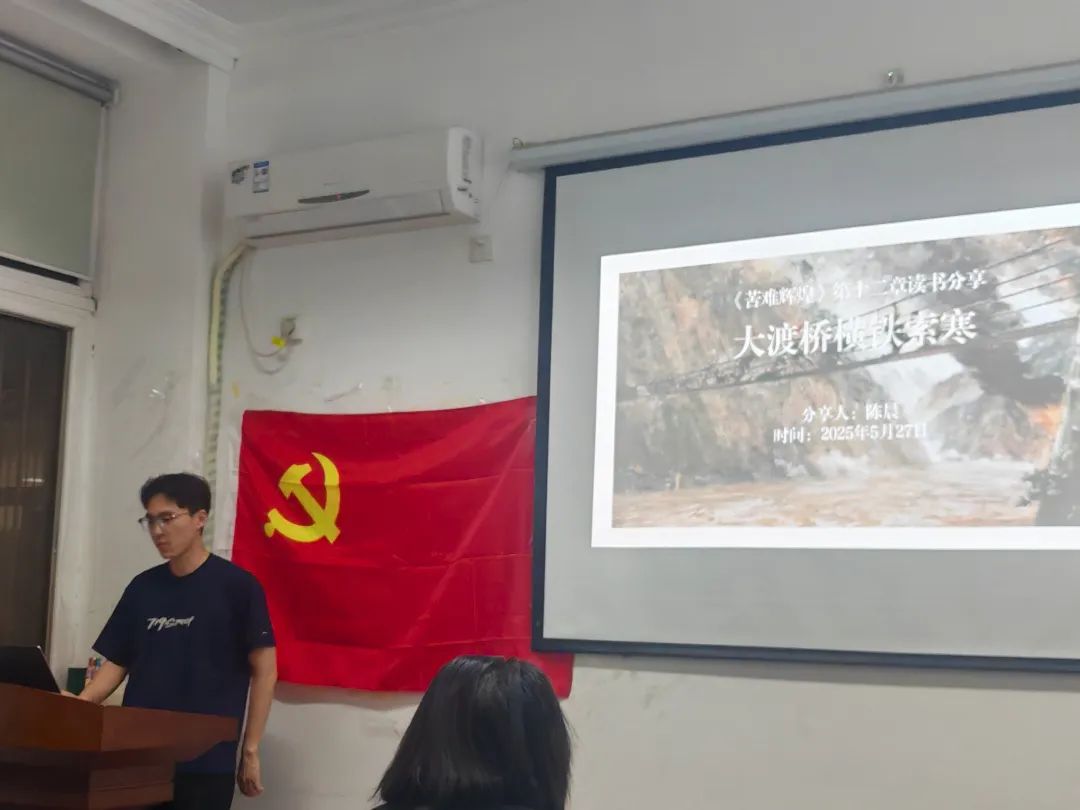 接着,第一党小组的陈晨同志分享了《苦难辉煌》第十二章《大渡桥横铁索寒》。他用时间表介绍遵义会议至占领泸定桥的重大事件,用书中文字,展现了巧渡金沙江,强渡大渡河飞夺泸定桥的全过程。并用刘伯承对泸定桥的感叹突出夺下泸定桥对于红军的重要性。陈晨同志最后分享了自己对中国革命的深刻认识:“中国革命从来不是一场被看好的革命,中国共产党也从来不是一个被看好的政党,中国特色的社会主义道路同样从来不是一条两边鲜花盛开、中间铺上红地毯的道路。过去如此,今天如此,今后恐怕也是如此。”