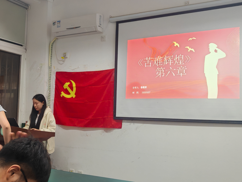 第四党小组的李若瑜分享了《苦难辉煌》第十章《瞩目大西南》,介绍了遵义会议的历史背景、会议进程以及在党史上的重要意义与价值,总结了遵义会议坚定信念、实事求是、独立自主、敢闯新路、民主团结的精神内涵,并播放相关影视片段,让大家直观地感受遵义会议的过程与内容,彰显了遵义会议的里程碑式意义。