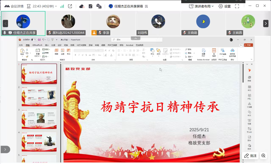 在抗日战争胜利80周年之际,为深切缅怀革命先烈的丰功伟绩,赓续红色血脉,2025年9月21日晚19:00,格致党支部以组织开展了“历史上的九月——‘铭记九一八 吾辈当自强’”主题党日活动。本次活动通过引导成员们回望历史,从中汲取精神力量,进而坚定理想信念,凝聚起奋进新征程的磅礴合力。
