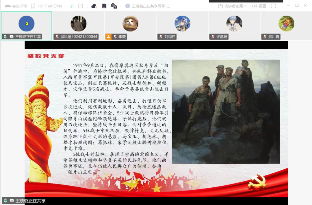 景川蓉:本次党日活动中,支部四位同志分享了汪雅臣、狼牙山五壮士、刘老庄连和杨靖宇等抗日英雄的感人事迹。这些故事中,既有我们耳熟能详的壮烈篇章,也有以往了解不多、经深入挖掘而呈现的动人细节,极大拓展了我的认知视野,也更加深刻地提醒我们:必须铭记历史、珍爱和平。这些英雄人物,正是千千万万抗日志士的缩影——历史中有无数像汪雅臣那样在觉醒后毅然扛起民族大任的忠诚战士,也有无数如刘老庄连一般坚守阵地、战斗至最后一刻的英雄集体,更有像杨靖宇那样在极端困难中宁死不屈、以草根棉絮果腹仍奋战到底的铁血将军。他们的精神跨越时空,依然熠熠生辉,不断激励我们不忘初心、牢记使命,在新时代征程中坚定前行。