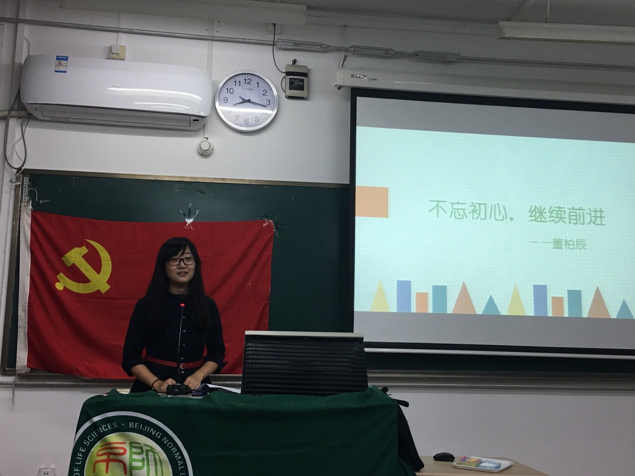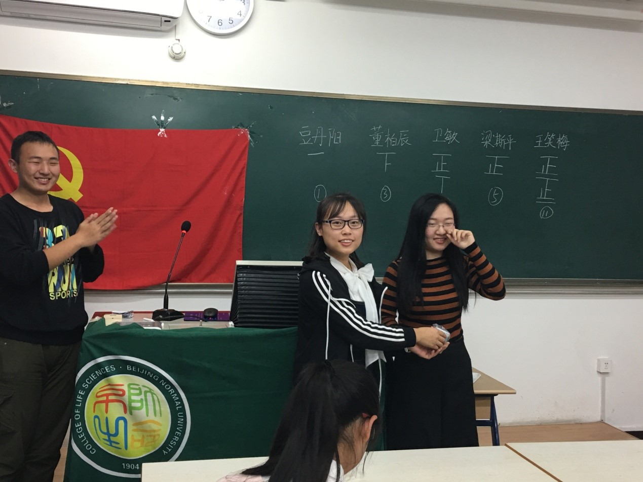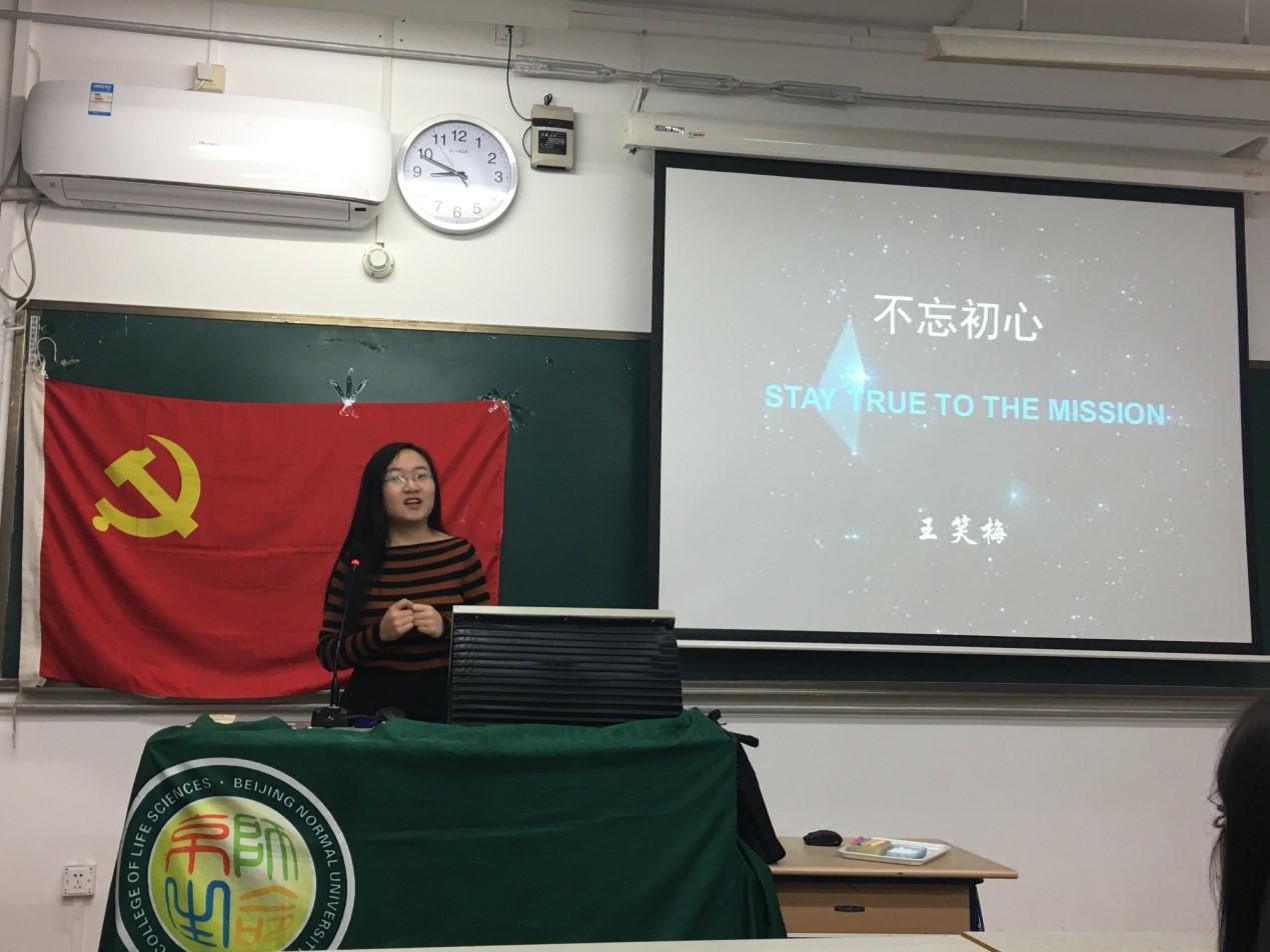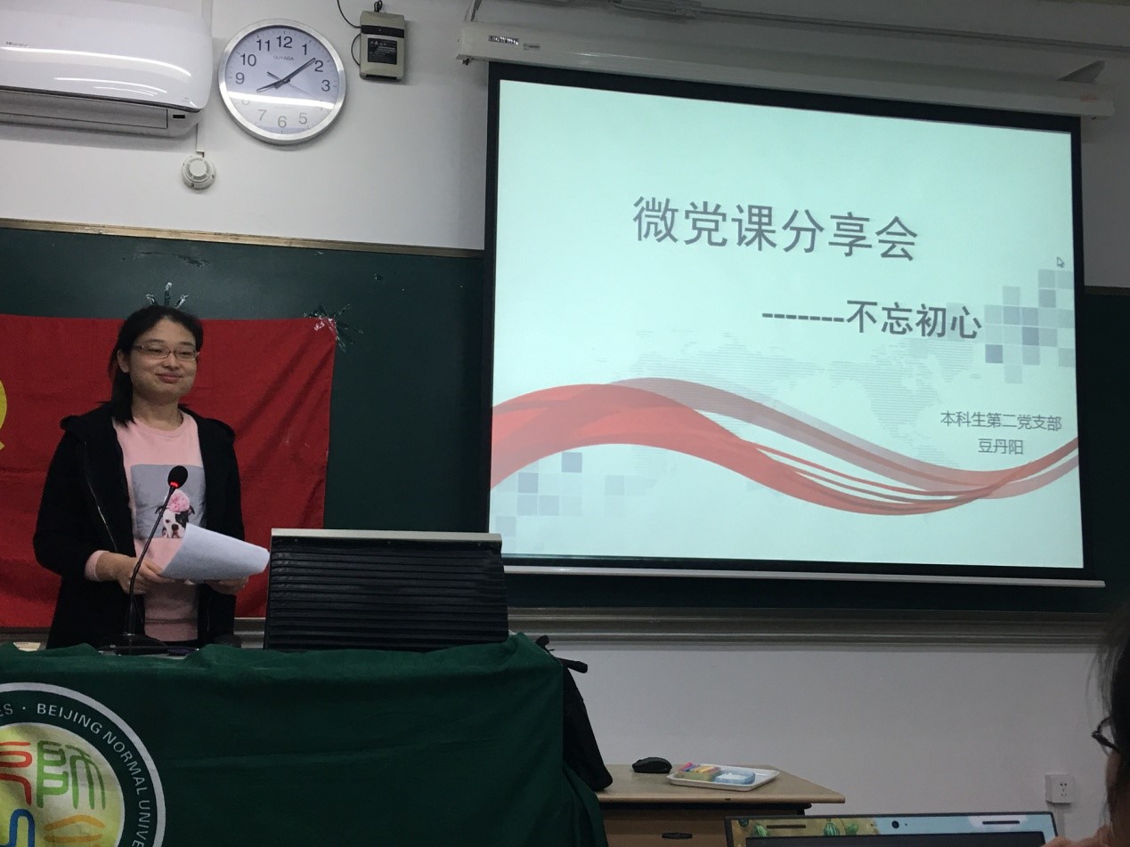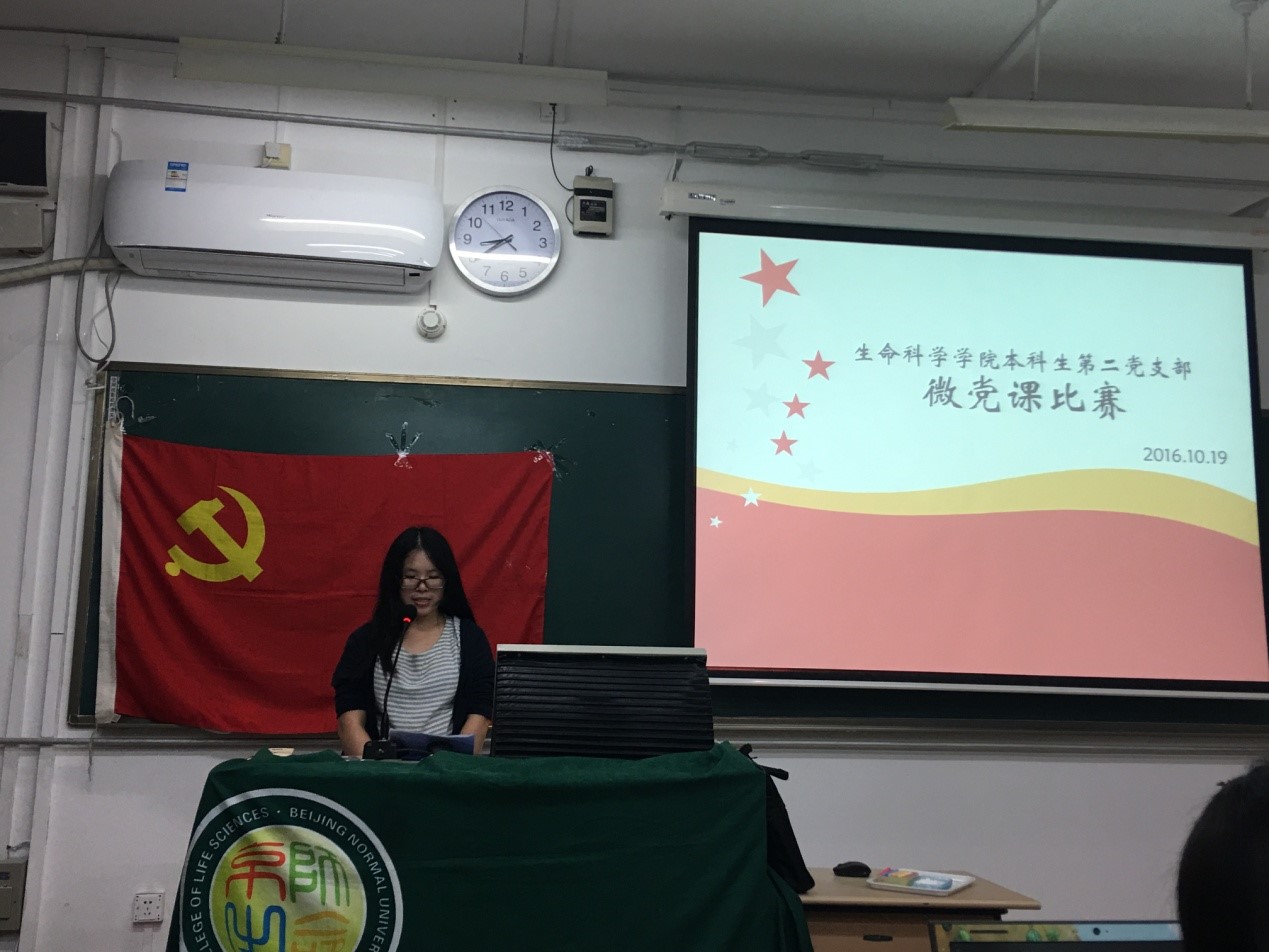 在这次活动中,本科生本科生第二党支部成员共同观摩学习支部的微党课。由支部内报名参加比赛的预备党员及积极分子向支部成员分享和交流,由党员梁钰同学主持。8:05活动正开始。集体起立,共唱《国际歌》,之后通过抽签决定比赛次序,依次为豆丹阳、董柏辰、卫敏、梁斯平、王笑梅同学。豆丹阳同学讲述了“不忘初心,继续前行”内容及深刻含义;董柏辰同学通过讲述屠呦呦以及颜宁老师的事迹,来阐明自己对于“不忘初心,继续前行”的理解——最初的理想是未来前行的动力;卫敏同学从最新上映的电影《湄公河行动》开始引入话题,讲述了为理想信仰而付出的军人,并且结合自己祖辈的事例,讲述了自己对“不忘初心,继续前行”的理解——坚定理想信念,并为此不断努力;梁斯平同学从小见大,结合自己的高中及现在的实习经历,以对老师这一职业的理解阐述了对“不忘初心,继续前行”的理解——为人之师,尽己之责,不忘本心;王笑梅同学从北大的宣传电影《星空日记》入手,讲述了梦想与现实的关系——不是现实支撑了梦想,而是梦想支撑了现实,而所谓的“不忘初心,继续前行”,便是追随了初心,即是追随了梦想。9:00观众开始进行现场投票,王笑梅获得一等奖,卫敏、梁斯平获得二等奖,豆丹阳、董柏辰获得三等奖。最后,由上界微党课参赛代表潘超颖师姐颁发一等奖,上届支委赵琳祎颁发二等奖,本届准支委吕欢颁发三等奖。9:15本次微党课比赛结束。