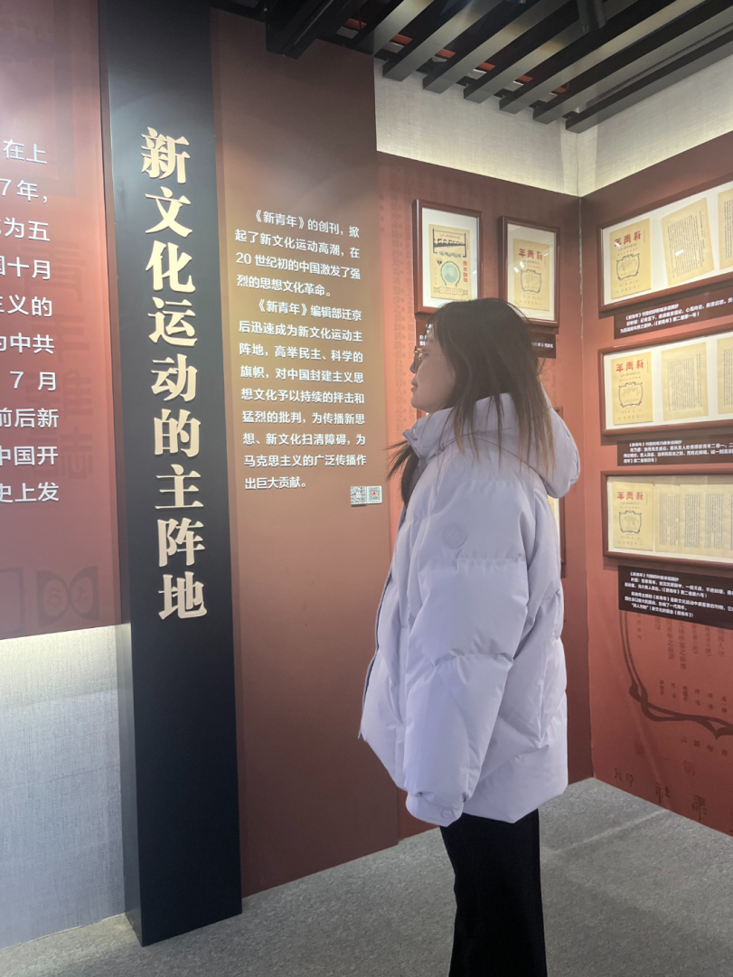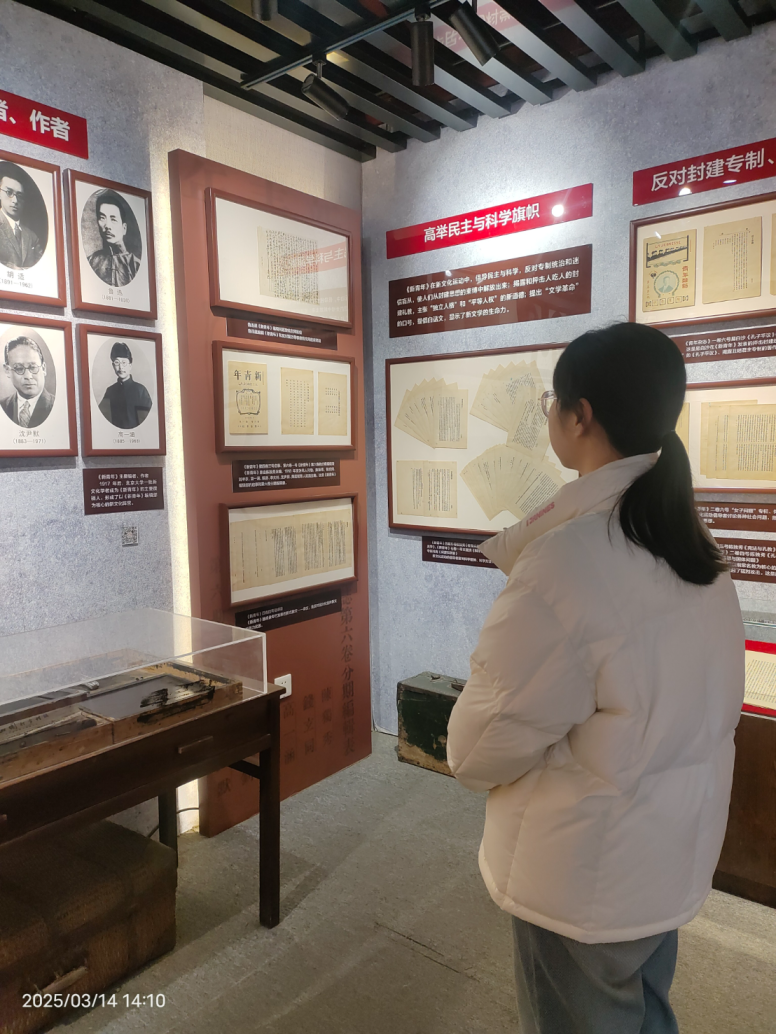 杨靖渝:3月14日下午在党支部的带领下,我参观了陈独秀故居。这里还曾是《新青年》杂志编辑部,是新文化运动主阵地和马克思主义早期传播重要场所。参观这里,我感受到了陈独秀为唤醒民众、追求真理所做的不懈努力。我们要传承先生的精神,以知识为力量,为中华民族伟大复兴奉献力量。