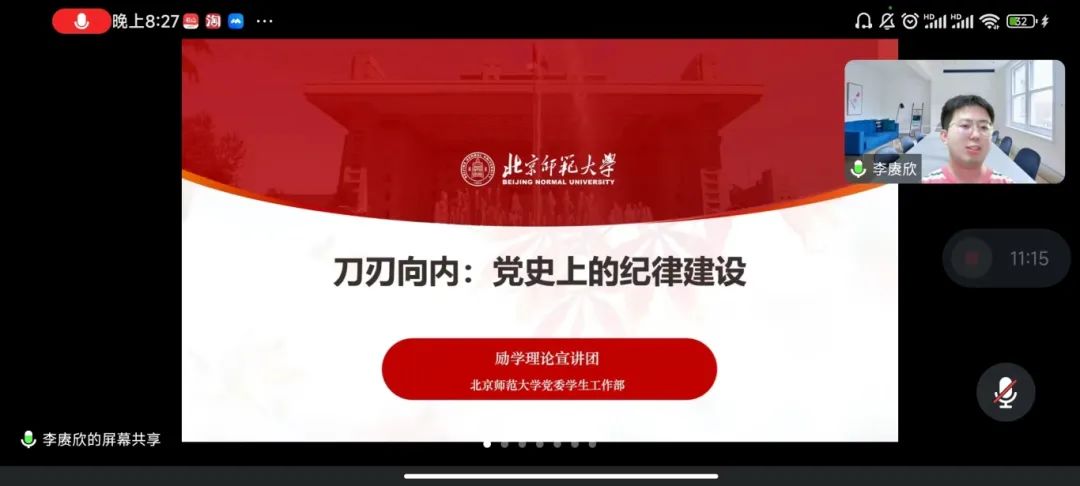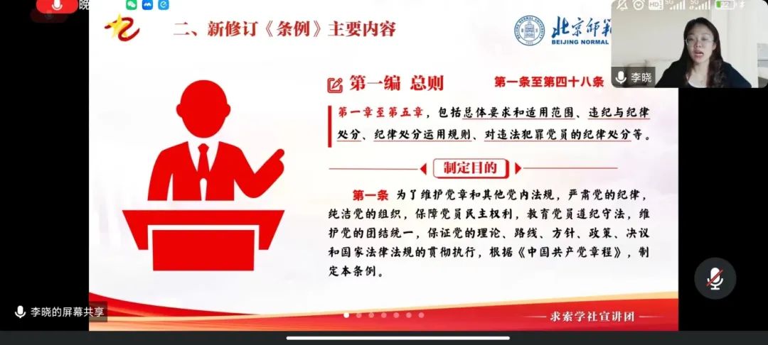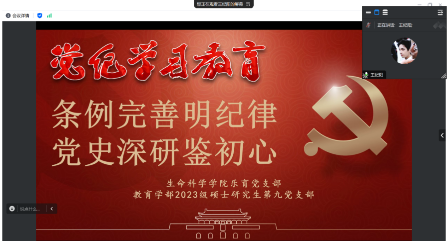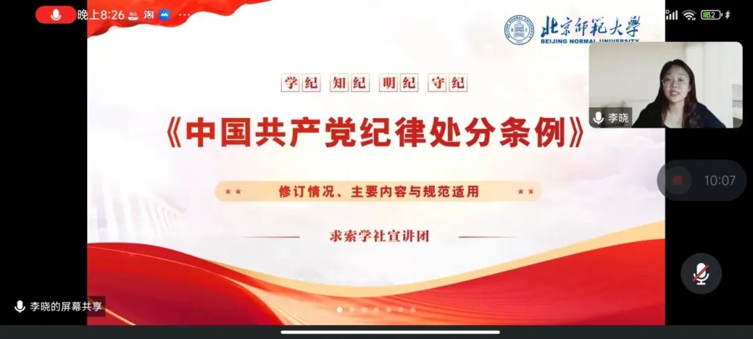 为深入学习贯彻习近平总书记关于党纪学习教育重要讲话和重要指示精神,加强支部党纪建设,树立支部良好党纪风尚,2024年5月21日晚20:00,教育学部2023级硕士研究生第九党支部与冰球突破豪华版官方网站乐育党支部,共同邀请了求索学社宣讲团的李晓同志,进行以《〈中国共产党纪律处分条例〉修订情况、主要内容与规范适用》为主题的宣讲活动,并邀请教育学部2023级硕士研究生第九党支部书记李赓欣进行了以《刀刃向内:党史上的纪律建设》为主题的支书讲党课活动。活动由冰球突破豪华版官方网站乐育党支部书记王纪阳主持,六十余名同学通过腾讯会议在线参会。