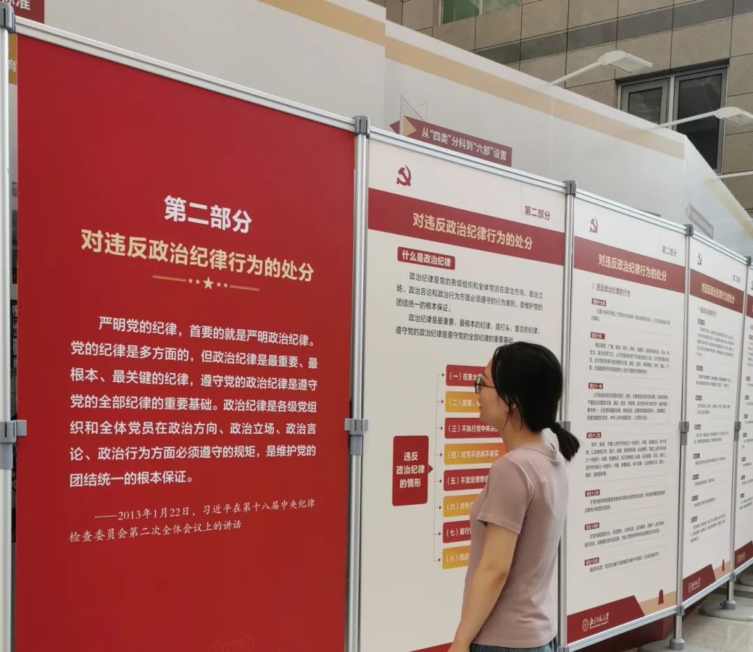 2024年5月16日召开的“支书讲党课”上,张萍同志已经带领全体支部党员认真学习《条例》并对关键内容进行了解读,特别是修改条款和新增条款。支部党员们将上次理论学习与本次主题专题展览相互印证,加深了印象,现场还就如何在平时的教学科研中明纪守纪展开了讨论。