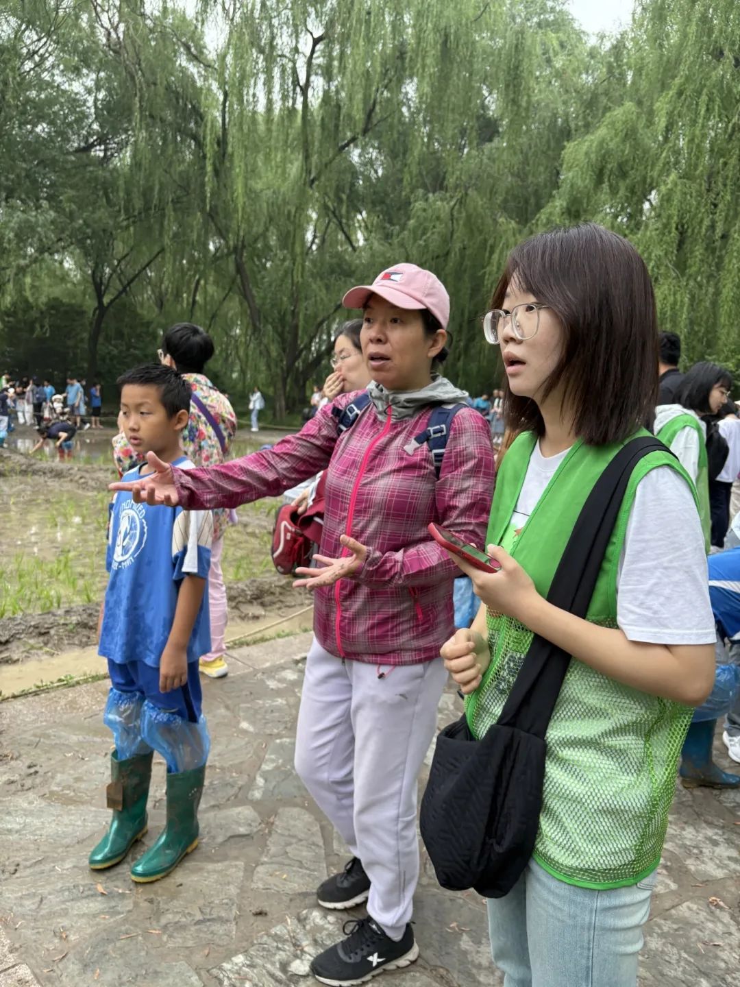 下午14:00,志愿者们陆续抵达海淀公园御稻流香景区。海淀公园的活动负责老师带领志愿者们熟悉各项工作流程、交代注意事项后,志愿者们换上绿马甲,分别协助工作人员开展回答游客咨询、登记排号指引、鞋套和雨靴发放、收割现场秩序维持等工作。