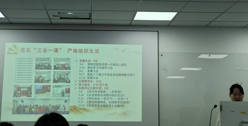 会议第二项,党支部书记徐雪妍代表上一届党支部委员会作支部工作报告。报告总结了落实“三会一课”严格组织生活、党纪学习教育开展情况、庆祝建国75周年“四个一”完成情况和立身党支部特色化建设情况。