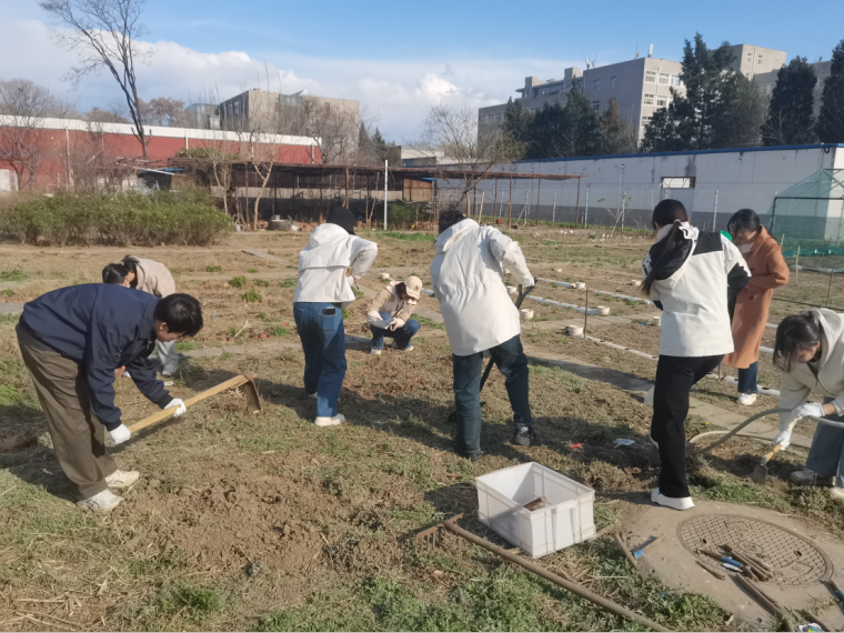本次活动主要内容是对荒地进行翻土除草、清理草根,成员们手握锄头、铁锹等工具,将板结土壤翻松,为后续科研实验及教学准备打下基础。