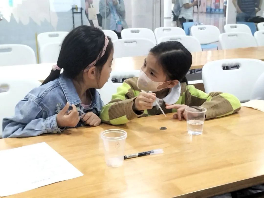 在拓展实验环节,主讲人顺着小朋友们不同组的现象有区别的疑问进行拓展提问,带着小朋友们尝试分析为什么实验组的馒头加碘液后现象有些许不同,小朋友们积极思考,踊跃发言。最后,主讲人讲解了科学设计实验的重要性,提高了小朋友们对科学的认知和兴趣。